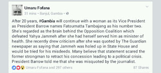 After 20 years, Gambia will continue with a woman as its Vice President as President Barrow names Fatoumatta Tambajang as his number two. She's regarded as the brain behind the Opposition Coalition which defeated Yahya Jammeh after she had herself served him as minister of health. She recently drew criticism after she was quoted by The Guardian newspaper as saying that Jammeh was holed up in State House and would be tried for his misdeeds. Many believe that statement scared the former strongman to retract his concession leading to a political crisis. President Barrow told me that she was misquoted by the journalist.